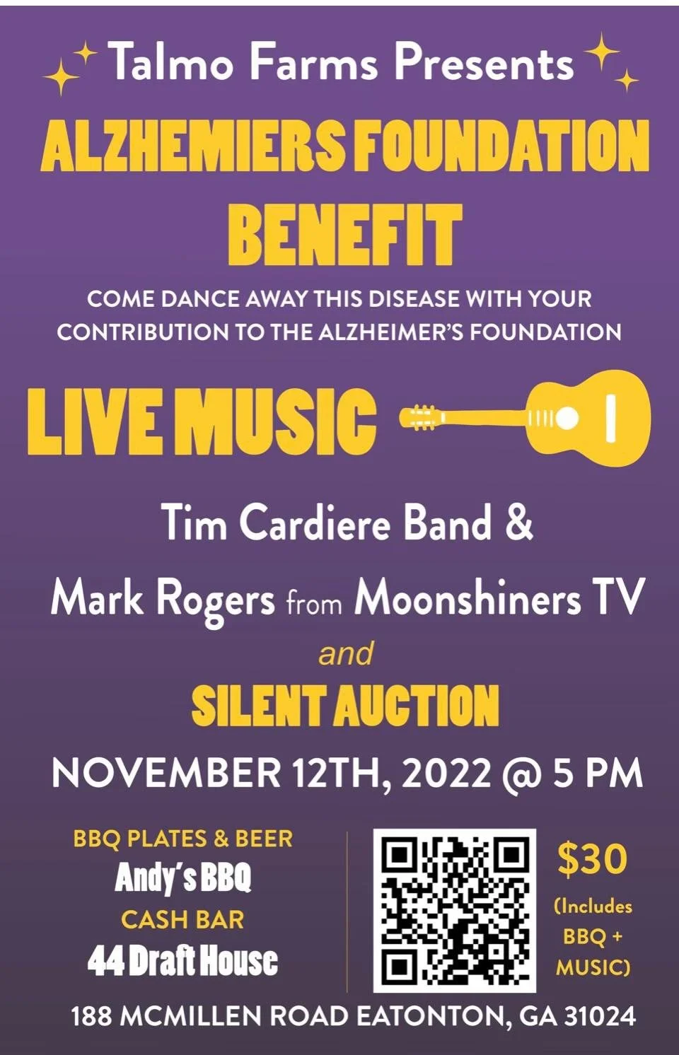Back to All Events Alzheimer's Foundation Benefit at the Farm Saturday, November 12, 2022 5:00 PM 9:00 PM Talmo Farms 188 Mcmillen Road Eatonton, GA, 31024 United States (map) Google Calendar ICS Grab your tickets now to Talmo Farms’ upcoming event, Alzheimer's Foundation Benefit at the Farm! Tickets are $30 and will include a bbq plate, live music, and a special night! Please click the link below to purchase tickets! Alzhemier’s Foundation Benefit