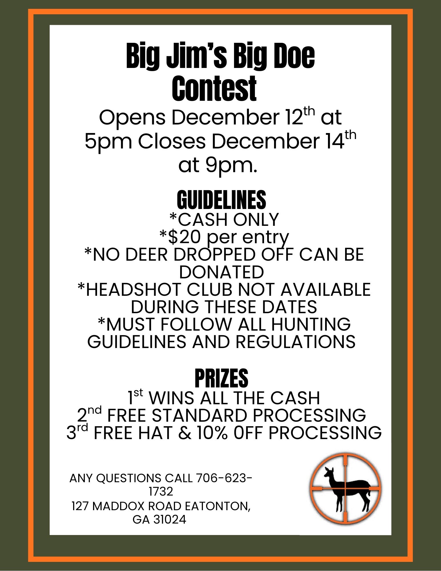 The annual Big Jim's Big Doe Contest is open for entries! The contest opens December 12th at 5 PM and closes December 14th at 9 PM. Entry is $20, cash only, and participants must follow all hunting guidelines and regulations. Prizes include all the cash for 1st place, Free Standard Processing for 2nd, and a Free Hat & 10% Off Processing for 3rd. Located at 127 Maddox Road, Eatonton, GA 31024.