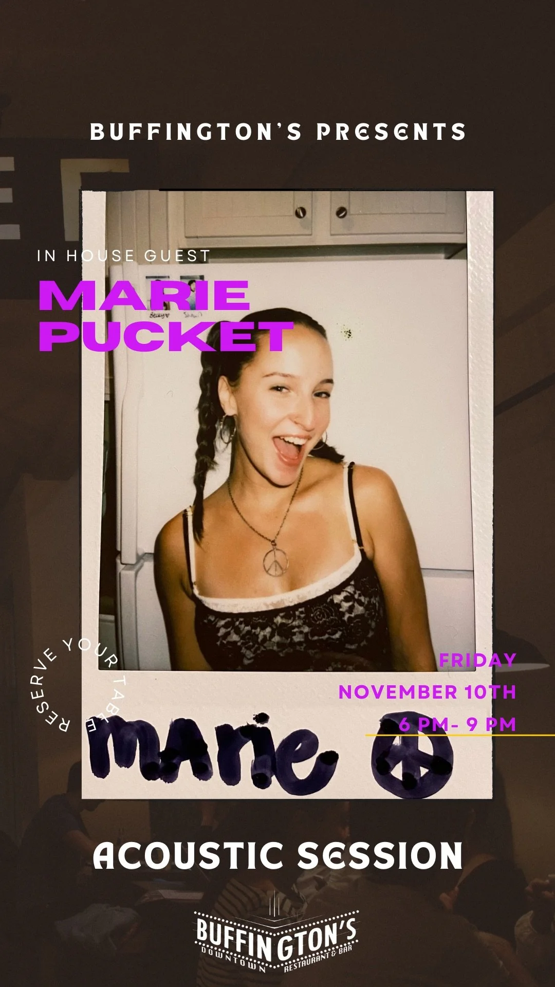 Experience a night of electrifying live music at Buffington's with the incredible Marie Pucket! With her unique sound and high-energy stage presence, Marie Pucket promises to keep you entertained and dancing all night long. So grab your friends and join them for an unforgettable evening of late-night live music at Buffington's!