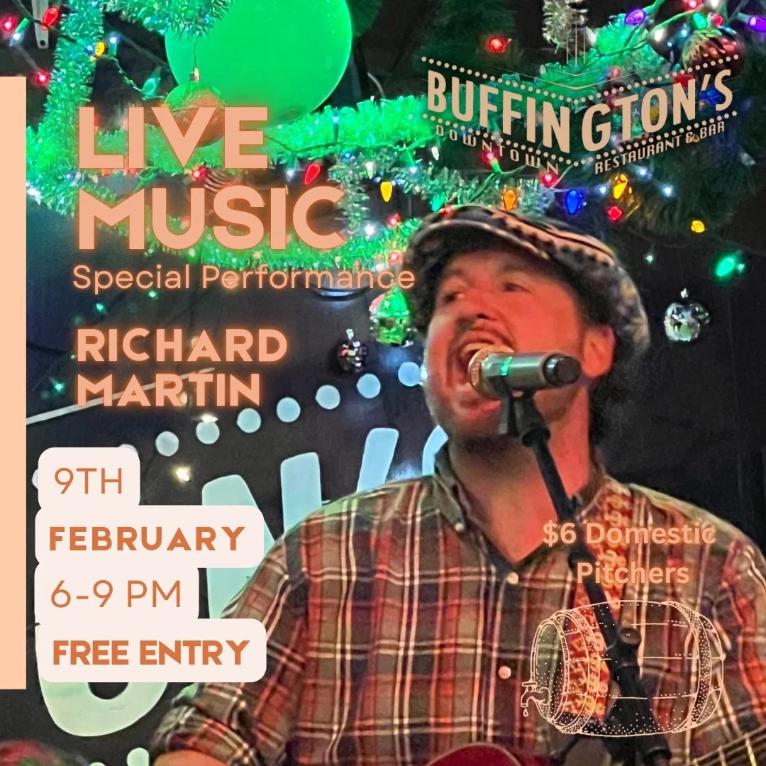 Don't miss out on a night of fantastic live music at Buffington's on February 9th! Richard Martin will be taking the stage and playing a mix of your favorite tunes. The music will begin at 6pm and continue until 9pm, so come early and stay late! Whether you're a music lover or just looking for a fun evening out, this event is sure to be a hit. Grab your friends and make your way to Buffington's for an unforgettable night of live entertainment!