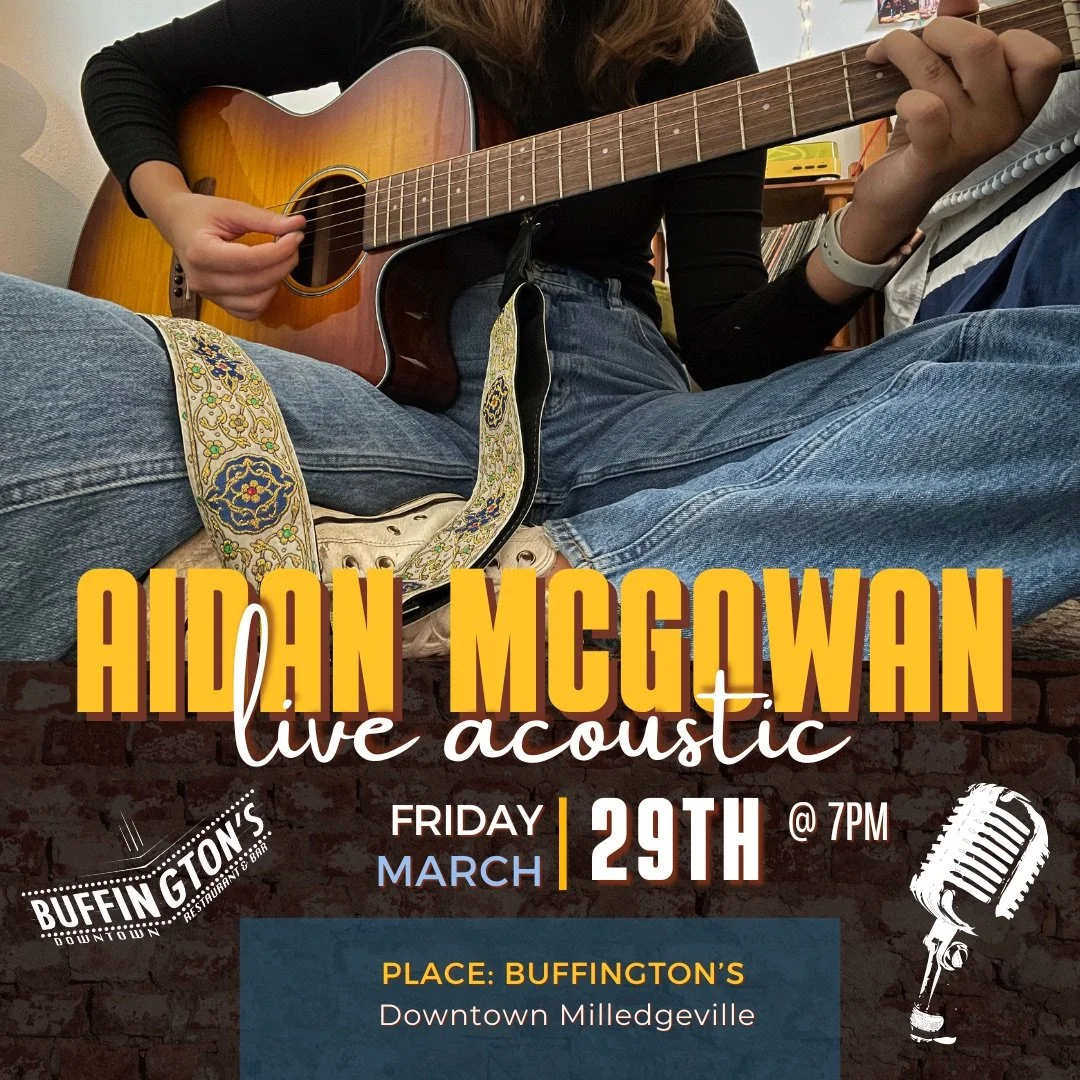 Come out to Buffington's on March 29th from 7pm to 10pm for live music by the talented Aidan McGowan! Enjoy the evening with great company, delicious ribeye steak, and drink specials. Best part? There's no cover charge! Don't miss out on a fantastic night of music and fun.