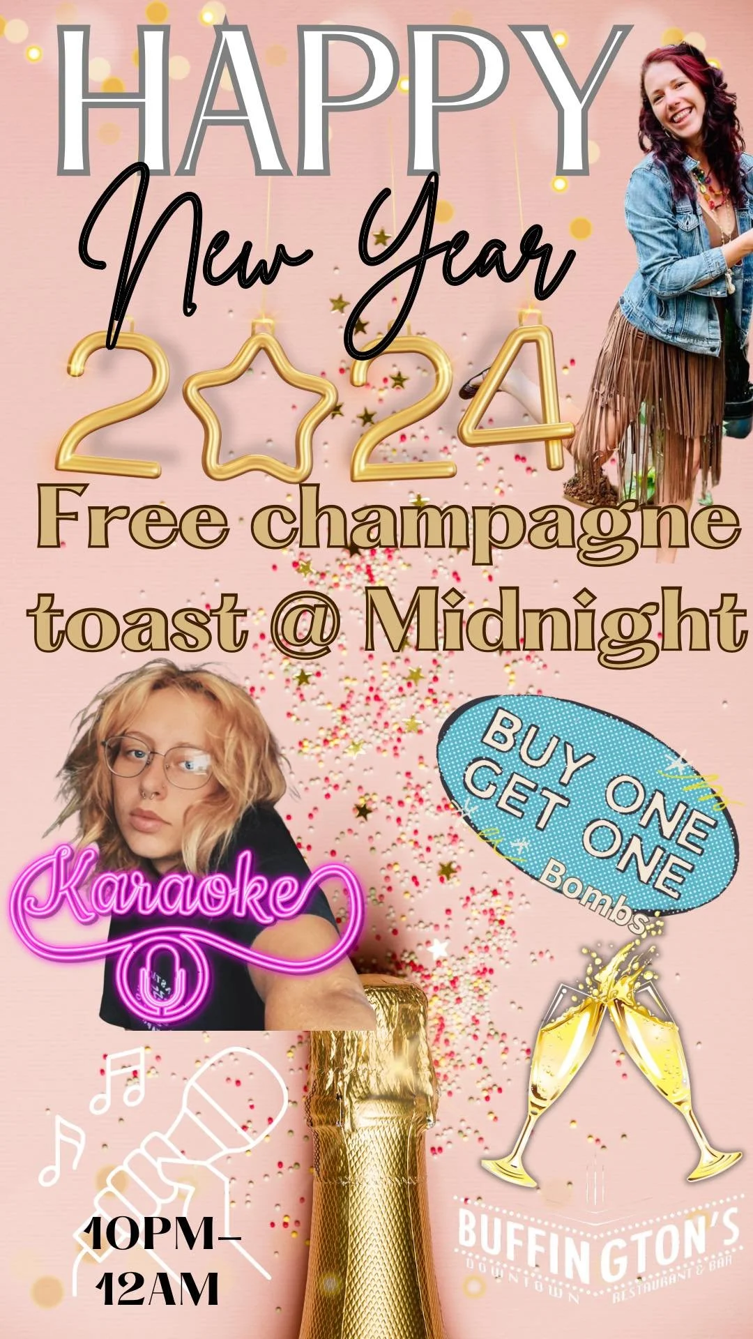 Join Buffington's for a night filled with karaoke, irresistible drink specials, and nonstop fun! Guests are invited to sing their hearts out all night long while enjoying the buy 1 get 1 bombs deal. As the clock strikes midnight, everyone will be treated to FREE champagne to toast to the new year.
