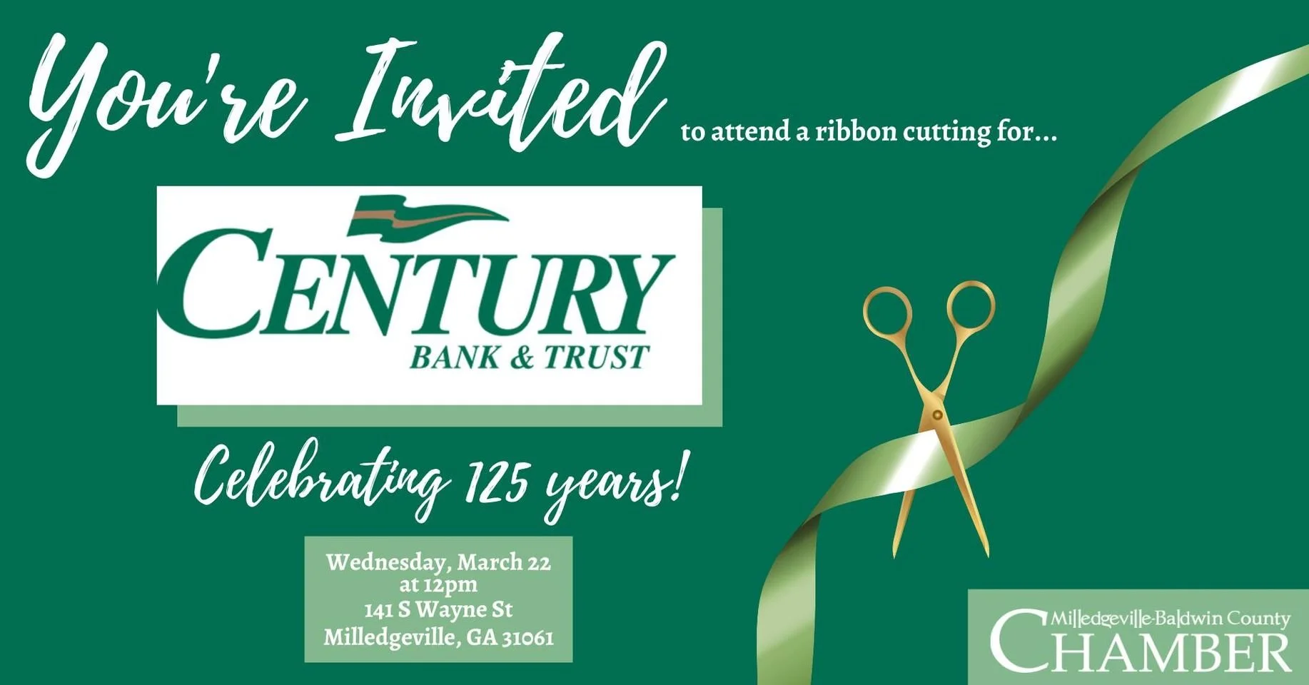 Century Bank & Trust Ribbon Cutting // MBC Chamber Wednesday, March 22, 2023 12:00 PM 1:00 PM Century Bank & Trust 141 South Wayne Street Milledgeville, GA, 31061 United States (map) Google Calendar ICS