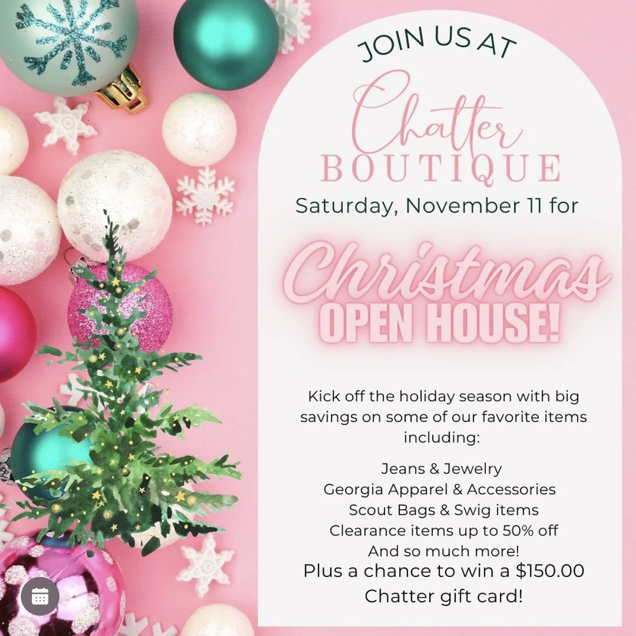 Chatter Boutique Christmas Open House Saturday, November 11, 2023 10:00 AM 6:00 PM Chatter Boutique 1821 North Columbia Street Milledgeville, GA, 31061 United States (map) Google Calendar ICS Join Chatter Boutique Saturday, November 11th, for our favorite time of the year… Christmas Open House! They are having sales throughout the store to celebrate the beginning of the holiday season. AND a chance to win a $150.00 gift card to Chatter!