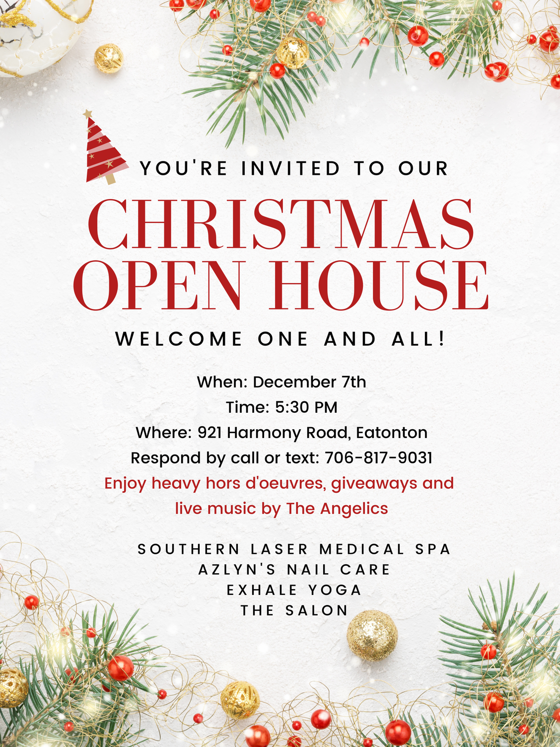 Join Southern Laser Medical Spa & Healing Arts at their Christmas Open House on December 7th and enjoy heavy hors d’oeuvres, giveaways and live music!