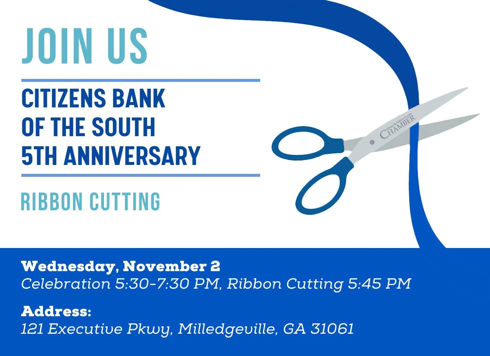 Join the Milledgeville-Baldwin Chamber on November 2 to celebrate Citizens Bank of the South's 5th Anniversary with a ribbon-cutting ceremony!
