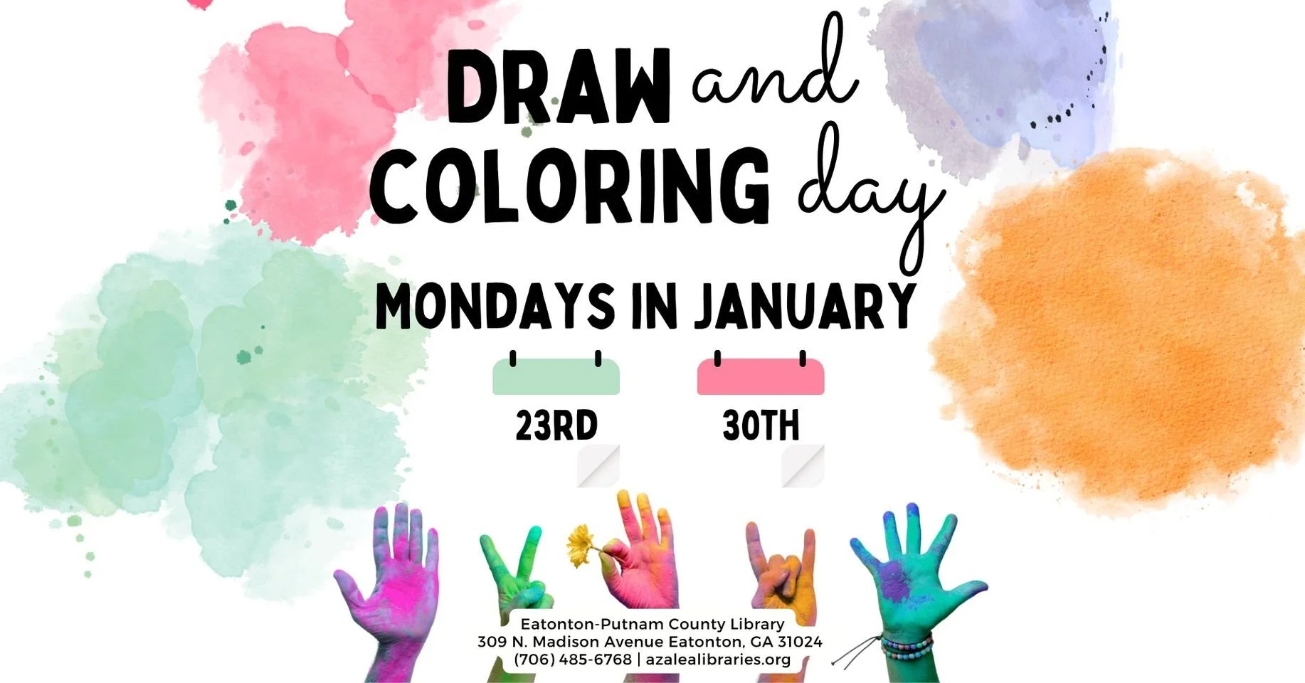 Join the Eatonton Putnam County Library all day for drawing and coloring. Drop in anytime during their open hours.