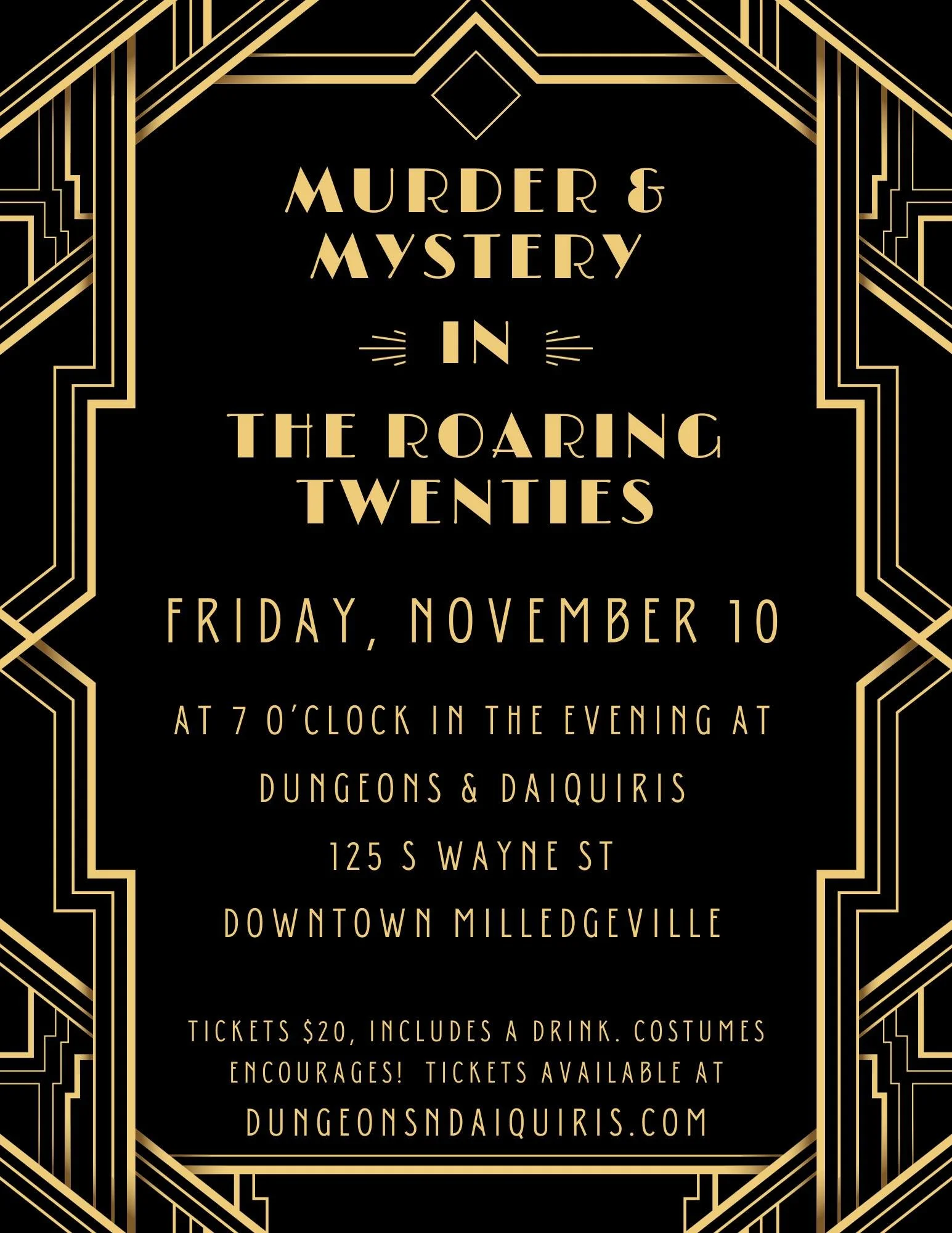 Step back in time to the glamorous era of the Roaring 20's as Dungeons and Daiquiris presents a thrilling Murder Mystery event! Gather your friends and loved ones for an unforgettable evening filled with mystery, intrigue, and delicious daiquiris. Tickets are priced at $30 per person or $50 per couple, making it a perfect opportunity for a fun date night.