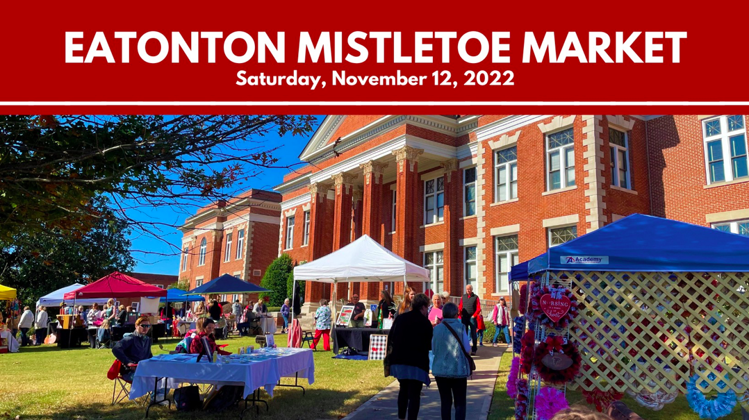 Eatonton Mistletoe Market Saturday, November 12, 2022 10:00 AM 3:00 PM Eatonton Main Street 201 North Jefferson Avenue Eatonton, GA, 31024 United States (map) Google Calendar ICS Join Eatonton Main Street on the Courthouse Lawn for a fun day of shopping! Arts & Crafts vendors will be selling their best items for Christmas so you don't want to miss this event!
