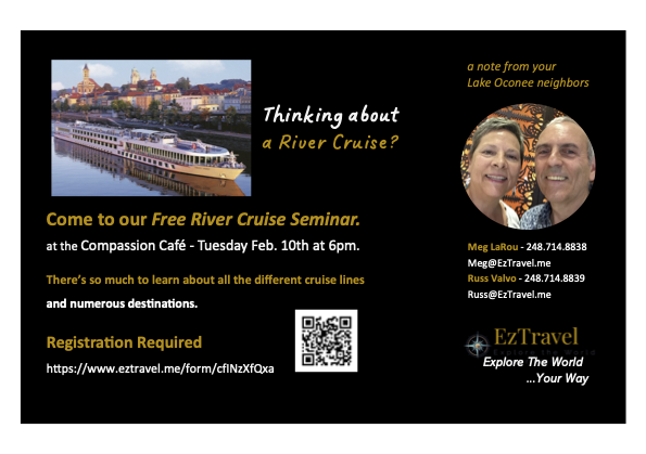 EzTravel invites the community to a Free River Cruise Seminar on Tuesday, February 10 at 6:00 PM at Compassion Café. This informative and relaxed evening is perfect for anyone considering a river cruise or simply curious about exploring the world by water.