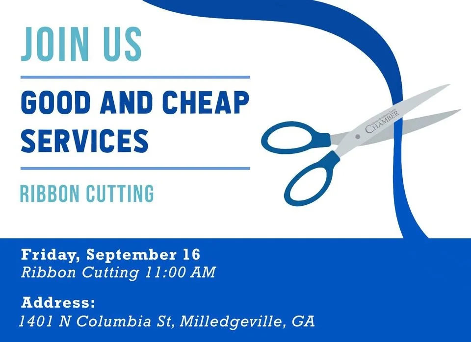 Good and Cheap Services Ribbon Cutting // Milledgeville-Baldwin Chamber of Commerce Friday, September 16, 2022 11:00 AM 12:00 PM Good and Cheap Services 1401 North Columbia Street Milledgeville, GA, 31061 United States (map) Google Calendar ICS Join the Milledgeville-Baldwin Chamber of Commerce on Friday, September 16 to celebrate one of the newest members of the Chamber Family, Good and Cheap Services!