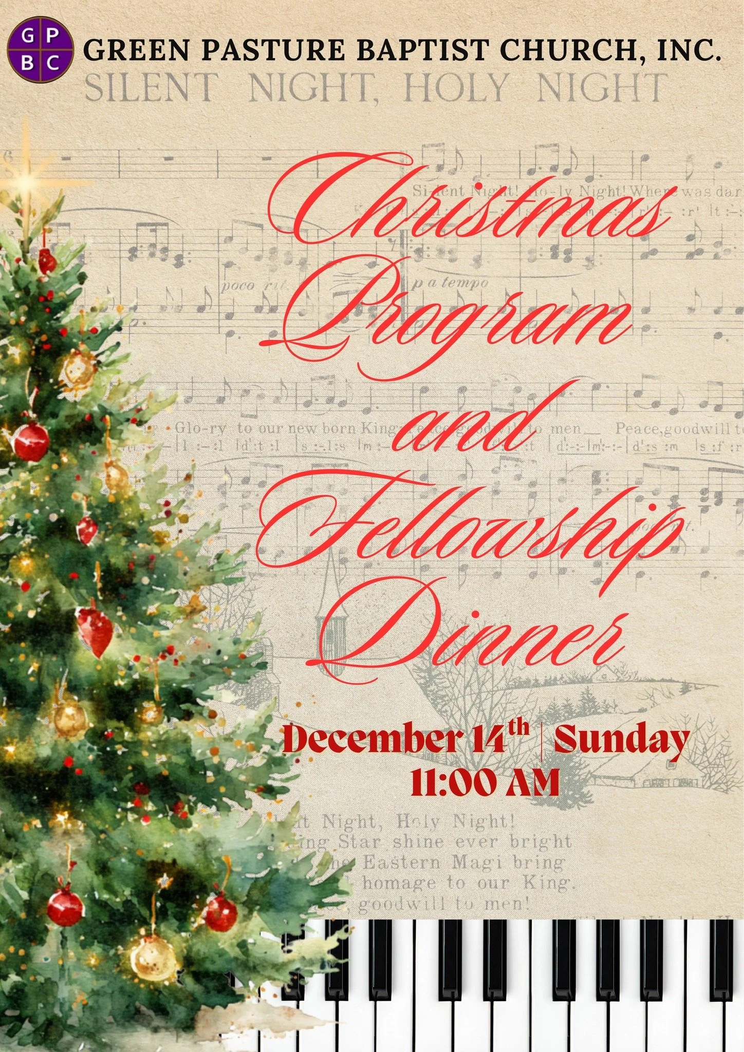 Join Green Pasture Baptist Church for their festive Christmas Program and Fellowship Dinner! The community is invited to celebrate Silent Night, Holy Night with a special program and dinner. The event takes place on Sunday, December 14th, starting at 11:00 AM. Bring your family and friends to share in the holiday spirit and enjoy fellowship at this heartwarming community event!