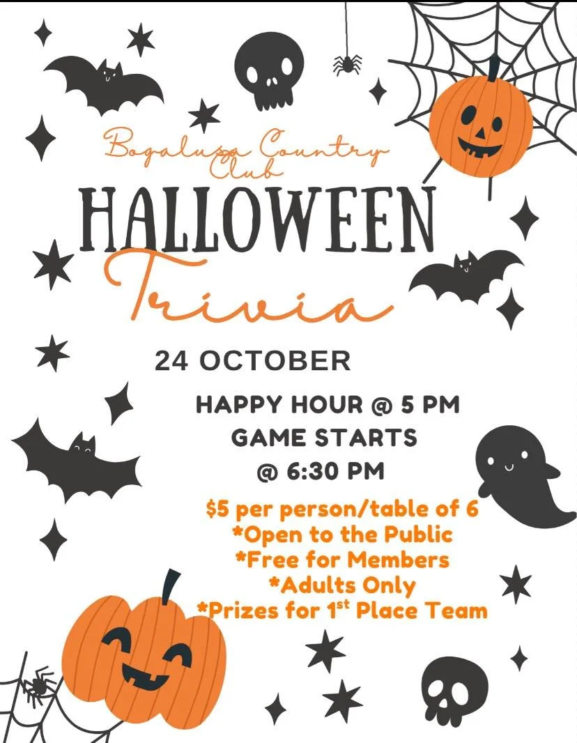 The Bogalusa Country Club is hosting a spooktacular Halloween Trivia Night on October 24! 🎃 Adults can enjoy happy hour at 5 PM before testing their knowledge at 6:30 PM.