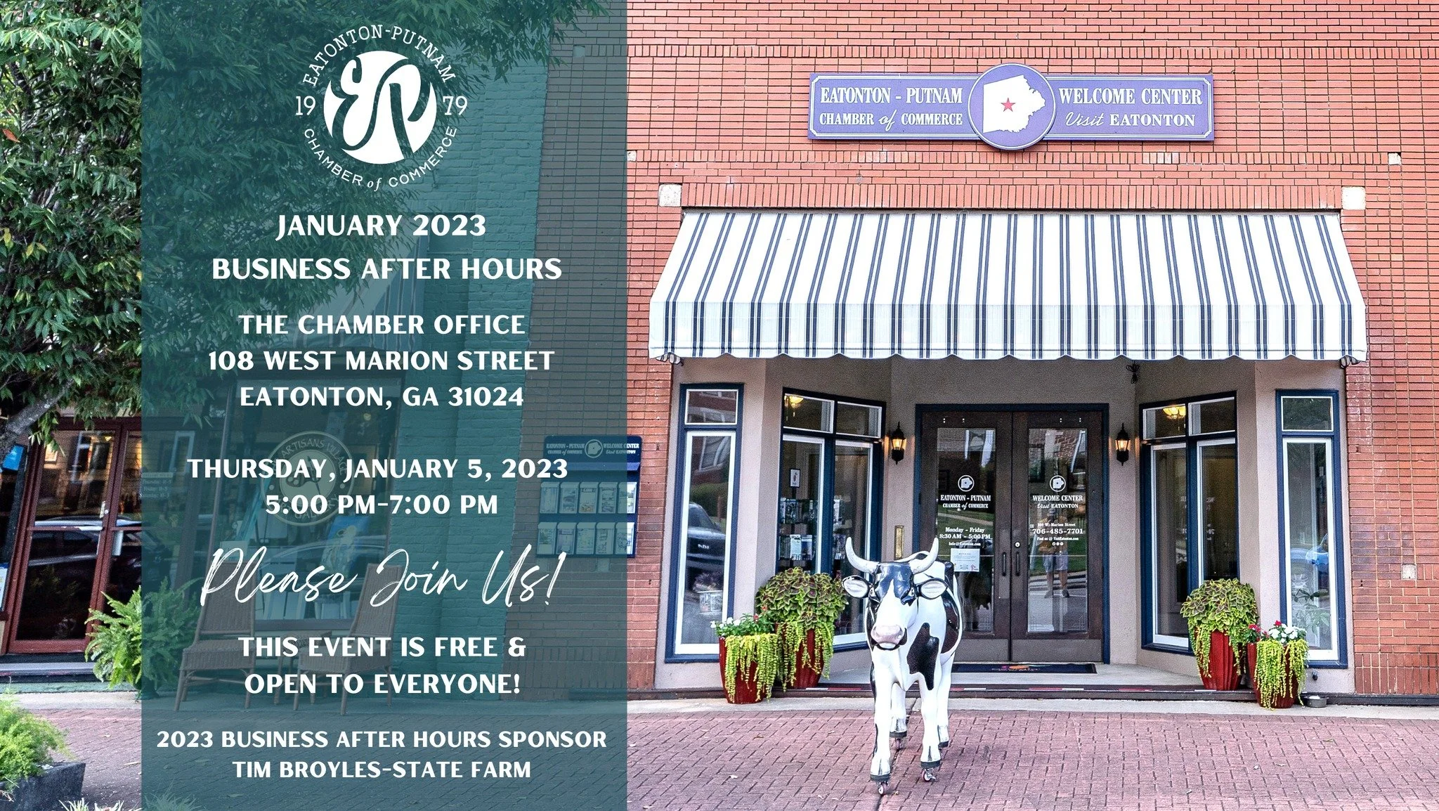 Get back into the groove after the holidays and join the Eatonton-Putnam Chamber of Commerce as they kick off the 2023 Business After Hours Series! Please join them for the January 2023 Business After Hours Thursday, January 5, 2023, 5:00 PM - 7:00 PM, at The Chamber Office in downtown Eatonton.