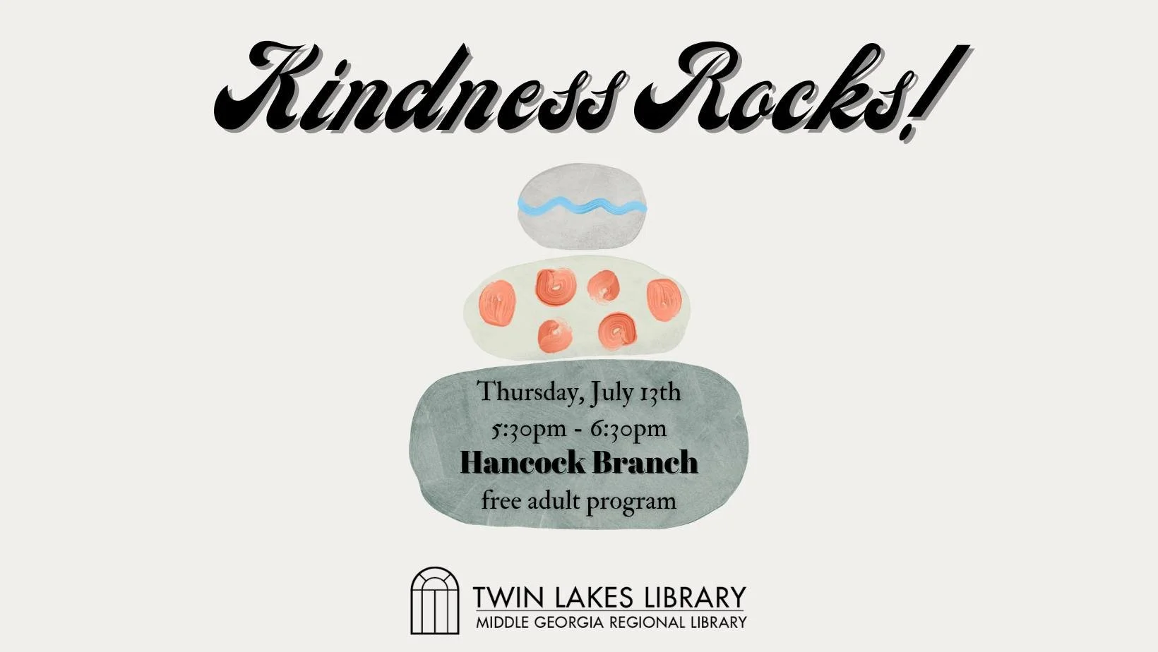 Kindness Rocks Painting Event Thursday, July 13, 2023 5:30 PM 6:30 PM Hancock Branch 127 East Hancock Street Milledgeville, GA, 31061 United States (map) Google Calendar ICS Embrace the SRP spirit of "All Together Now" by joining the Twin Lakes Library for a relaxed evening painting kindness rocks. Supplies will be provided on a first come, first served basis. Bring a friend and spread some cheer in our community! This is an adult program only!