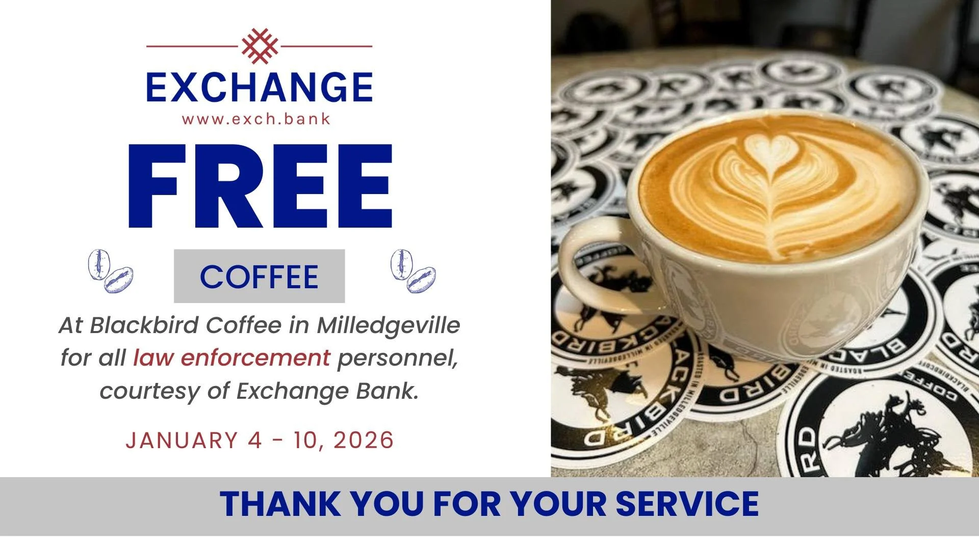 Exchange Bank is pleased to offer complimentary coffee at Blackbird Coffee in Milledgeville as a show of appreciation for all law enforcement personnel. This event runs from January 4 – 10, 2026. Law enforcement members are encouraged to stop by Blackbird Coffee during this week for their free beverage, courtesy of Exchange Bank (exch.bank). Thank you for your service!
