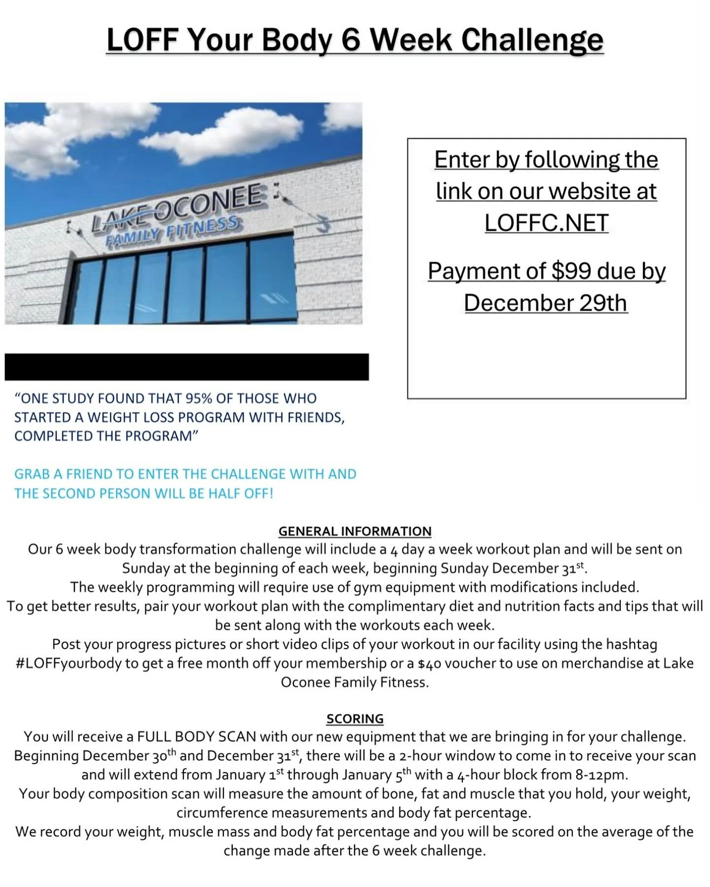 Lake Oconee Family Fitness is offering a 6 week body transformation challenge that includes a 4 day a week workout plan. The plan will be sent to participants on Sunday at the beginning of each week, starting on Sunday December 31st.