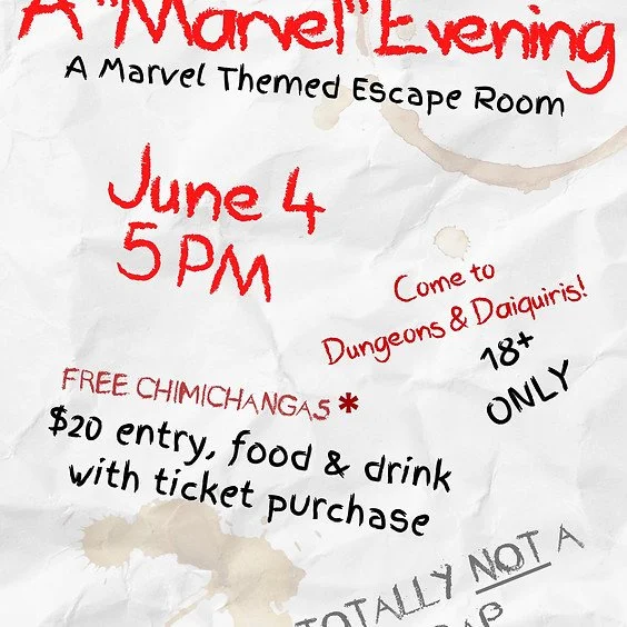 Join Dungeons & Daiquiris for A "Marvel" Evening with an Avengers theme and a Deadpool hosted Escape Room! Costumes encouraged!