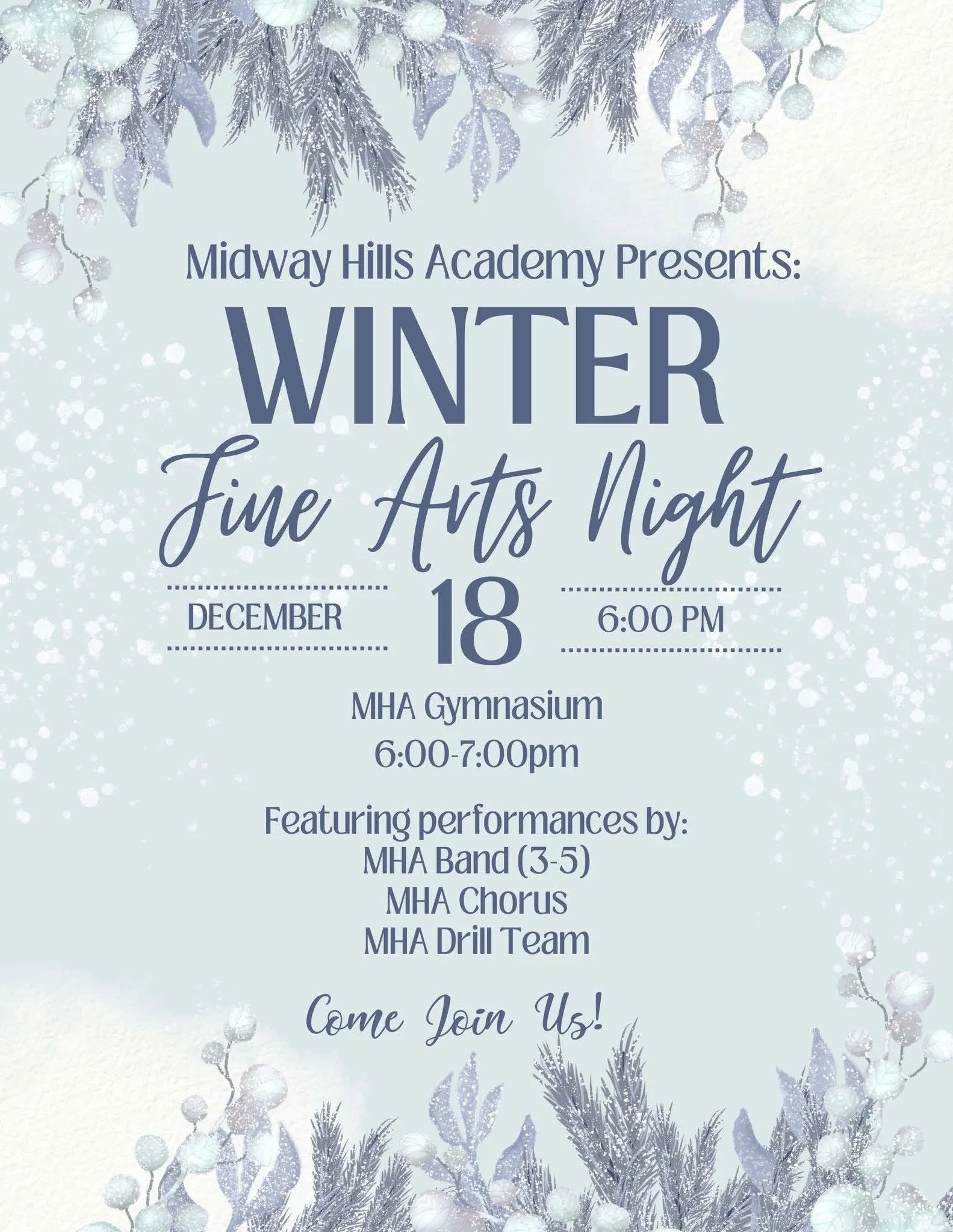 Midway Hills Academy presents their annual Winter Fine Arts Night on December 18th at 6:00 PM in the MHA Gymnasium. The evening features performances by the MHA Band (3-5), MHA Chorus, and the MHA Drill Team from 6:00–7:00 PM. This school arts event is a great way to support Midway Hills Academy students and celebrate the season!