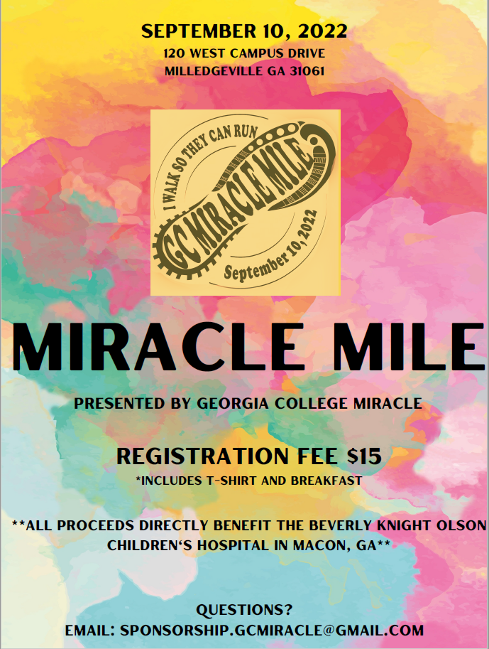 Miracle Mile 2022 is a 5k color run benefitting Beverly Knight Olson Children's Hospital. It will take place on September 17th, from 8am-noon at Georgia College's West Campus! Your registration price includes a t-shirt, breakfast, and a perfect opportunity to make a difference. You don't want to miss this day filled with color, face paint, warm-ups, merch, and more.