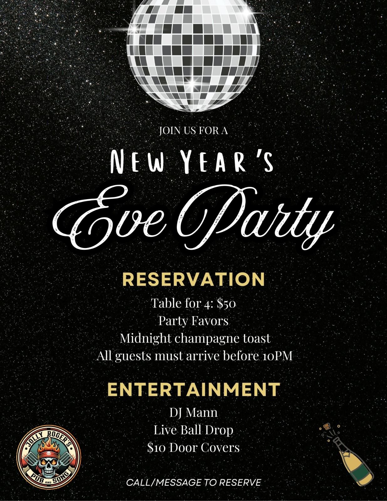 Ring in the New Year at the Jolly Roger's Pub and Grub New Year's Eve Party! Enjoy entertainment by DJ Mann and a Live Ball Drop. Reservation for a table of 4 is $50 and includes party favors and a midnight champagne toast. $10 door cover. All guests must arrive before 10 PM. Call or message to reserve.