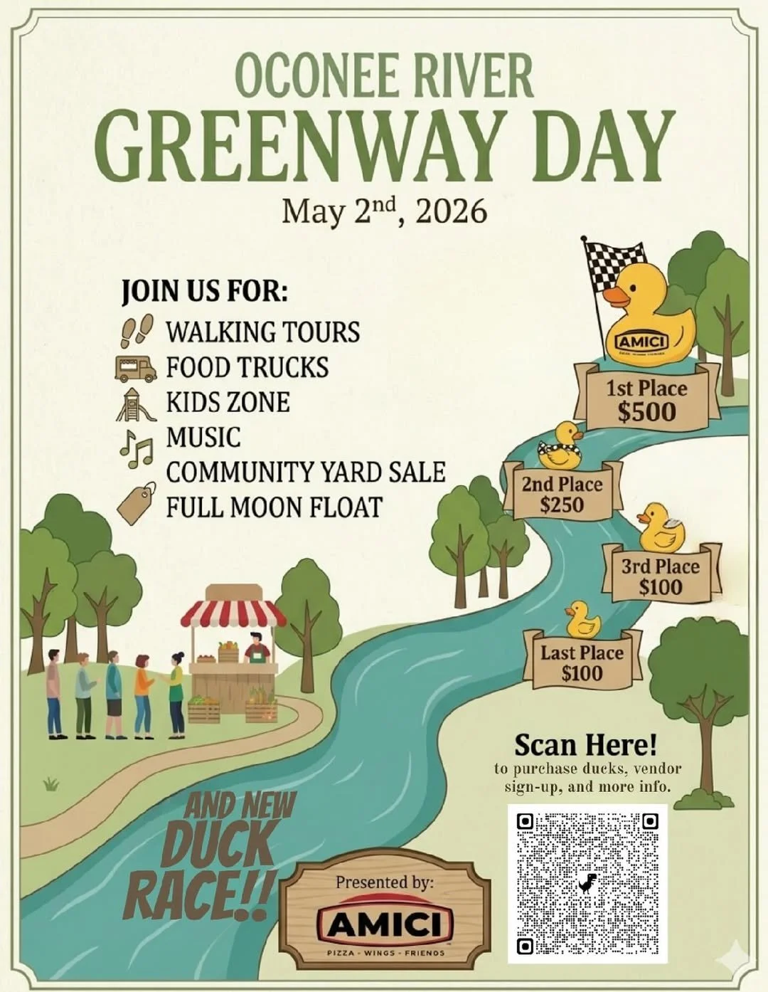 Join us on May 2 from 8 AM to 4 PM at the beautiful Oconee River Greenway for an exciting lineup of activities for all ages. Enjoy guided walking tours, delicious food trucks, live music, and a dedicated kids zone packed with fun.