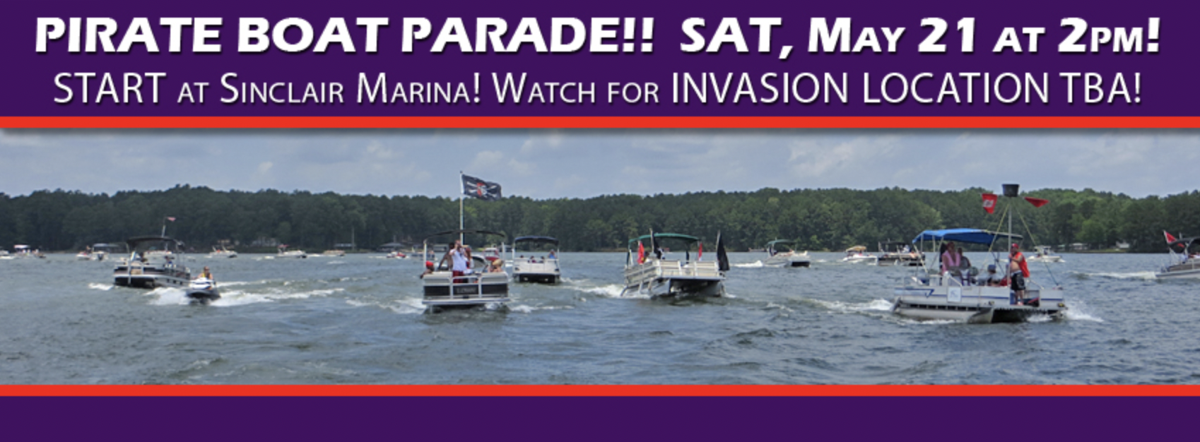 Ahoy mateys! The 10th Annual Lake Sinclair Pirate Parade will be held on Saturday, May 21st at 2:00pm. The parade will begin with a cannon blast from in front of Sinclair Marina and decorated boats will sail across the lake before setting anchor at Crooked Creek Marina. Participants will win prizes for best boat decorations and best costumes!