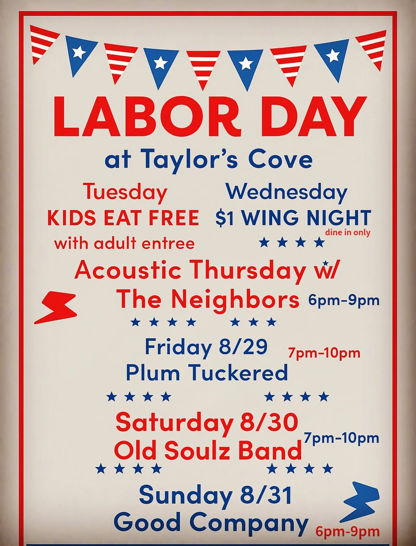 Kick off your Labor Day weekend at Taylor’s Cove with a night of live music from Plum Tuckered! From 7–10 PM on Friday, August 29, this talented group will bring their signature sound to the lakefront stage. Enjoy great food, cold drinks, and a fun, laid-back atmosphere as you soak in the tunes and the views. Gather your friends and start the holiday weekend off right at Lake Sinclair’s favorite waterfront restaurant and bar!