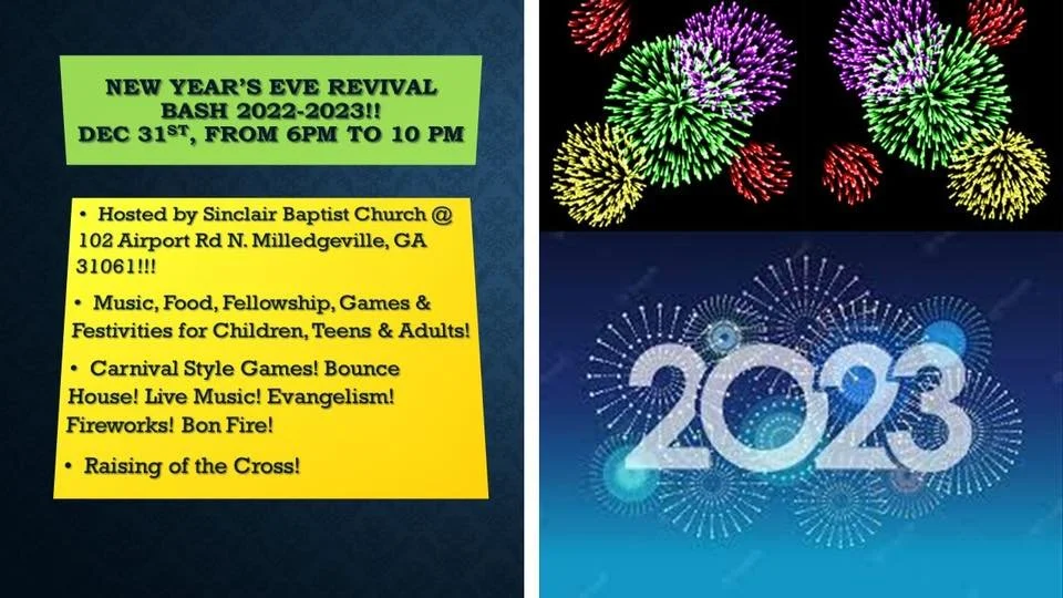 New Year's Eve Revival Bash 22-23 Saturday, December 31, 2022 6:00 PM 10:00 PM Sinclair Baptist 102 Airport Road Northeast Milledgeville, GA, 31061 United States (map) Google Calendar ICS SBC Will be holding a New Year’s Eve Revival Bash!!! The event will include Carnival Games for kids, Food, Bounce House, Prizes, Live Christian Music, and A Gospel Message! Fun for all ages and a great way to bring in the New Year in Christ.