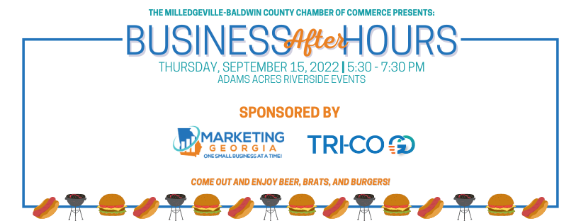 Business After Hours // Milledgeville-Baldwin Chamber of Commerce Thursday, September 15, 2022 5:30 PM 7:30 PM Adams Acres Riverside Events 150 Old River Bridge Road SE Milledgeville, Georgia 31061 United States (map) Google Calendar ICS 9/15/22 BAH Registration