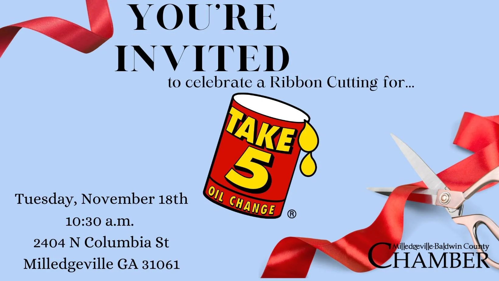The ribbon-cutting ceremony will take place on Tuesday, November 18th at 10:30 a.m. at 2404 N Columbia St, Milledgeville, GA 31061. Guests can meet the Take 5 team, see their quick and convenient oil change service in action, and connect with fellow community members who enjoy supporting local businesses!