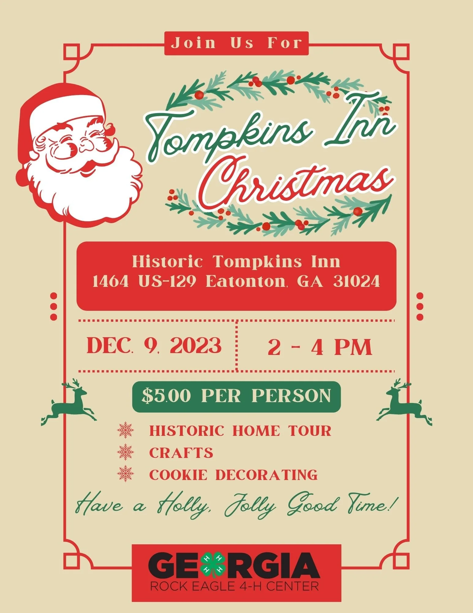 Come to the Historic Tompkins Inn at Rock Eagle 4-H Center for a delightful afternoon filled with cookie decorating, garland crafting, and a delicious spread of cornbread. Join in on the festive atmosphere around the campfire as you sing songs and enjoy a jolly good time.