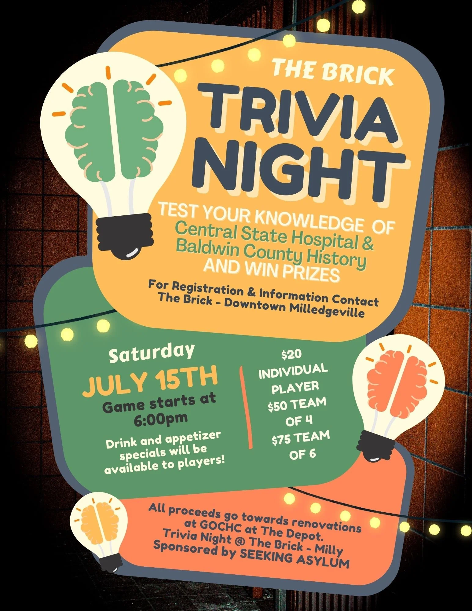 Come join Seeking Asylum, LLC at 6:00 pm on July 15th at the Brick for TRIVIA NIGHT and test your knowledge of Central State Hospital and Baldwin County history.